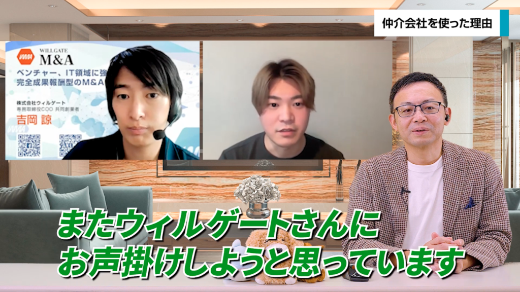 そういった部分で、本当はお互い合意できるいい塩梅があったのに、その前にそうじゃない理由のところでブレイクしてしまうっていうことはよく周りを見ててもあったりとか、よく起きることですし、M&Aの交渉って、キャッチボール早いようで意外と遅くて、日々、大企業で働いてるエリートの皆さんは忙しいので、連絡がなかなか返ってこないという場面も結構あるんですけれども、仲介のウィルゲートさんが入ってると、その辺をスムーズによしなにしていただけるというか、いい塩梅をお互いに寄り添って見つけていただけるので、結果的に売却のスピードも早いですし、チャンスも僕ら側と買い手さん側、二者間で交渉してブレイクするよりは、チャンスも多くなるっていう結論だと思っております。
