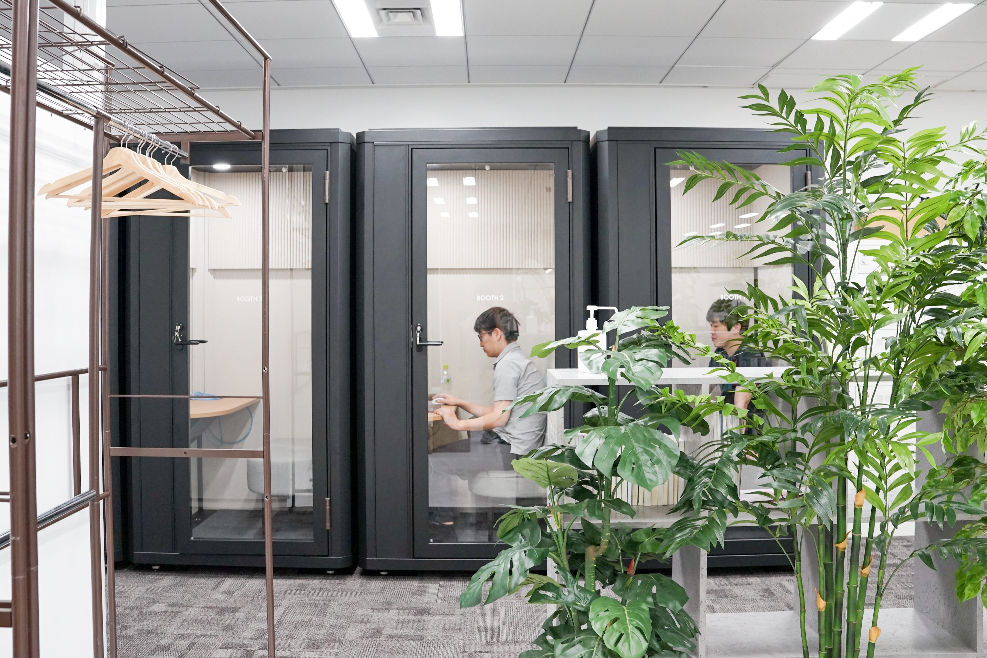 新オフィスでは、社員同士の会話、雑談などのコミュニケーションが生まれるリフレッシュエリアなど以前のオフィスの“良さ”を残しながらも、新たにテレビ会議用のワークブースを複数設置するなど、テレワーク × オフィスワークのハイブリッド型ワークスタイルをベースにした、多様な働き方が実現できる環境づくりにこだわっています。