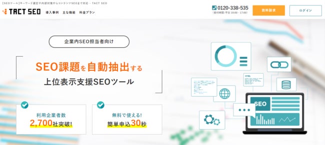 「TACT SEO」はウィルゲートが3,000社以上のSEOコンサルティングの知見をもとに開発した、狙ったキーワードで上位表示するためのSEOツールです。延べ3,200社(2022年1月時点)のSEO対策に取り組む企業様にご利用いただいています。SEOに必要なキーワード調査からコンテンツの課題分析の調査を自動化でき、SEO対策に関する業務全般をサポートしてます。作業を効率化することでコンテンツ集客力の向上に貢献します。