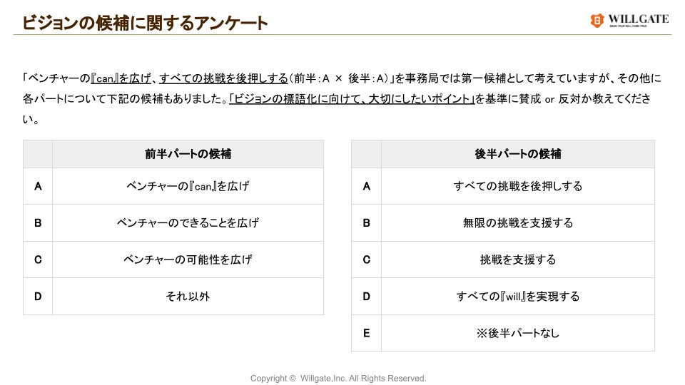 新設したビジョンの「ベンチャーの可能性を広げ、あらゆる挑戦を支援する」には、一人ひとりが『will』の実現に向けて前向きに挑戦できる社会、挑戦することが周りの人々へと波及していく世界をつくっていきたいという想いが込められています。