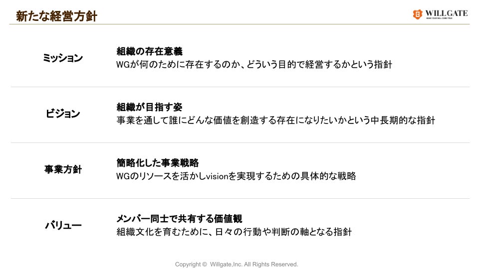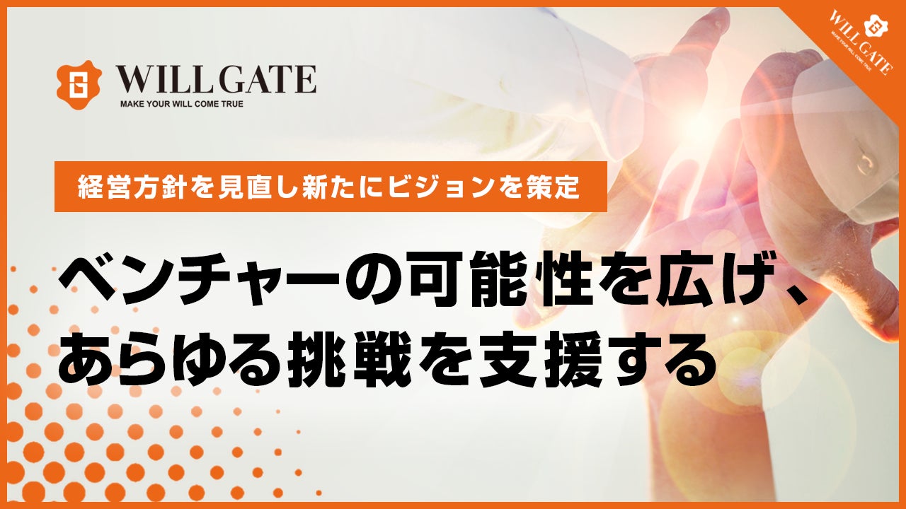 株式会社ウィルゲート(本社:東京都港区、代表取締役:小島 梨揮、以下 ウィルゲート)は、一人ひとりが『will』の実現に向けて前向きに挑戦できる社会、挑戦することが周りの人々へと波及していく世界をつくっていきたいという想いを実現するために、経営方針を見直し2022年9月1日より新たに「ベンチャーの可能性を広げ、あらゆる挑戦を支援する」というビジョンを掲げました。