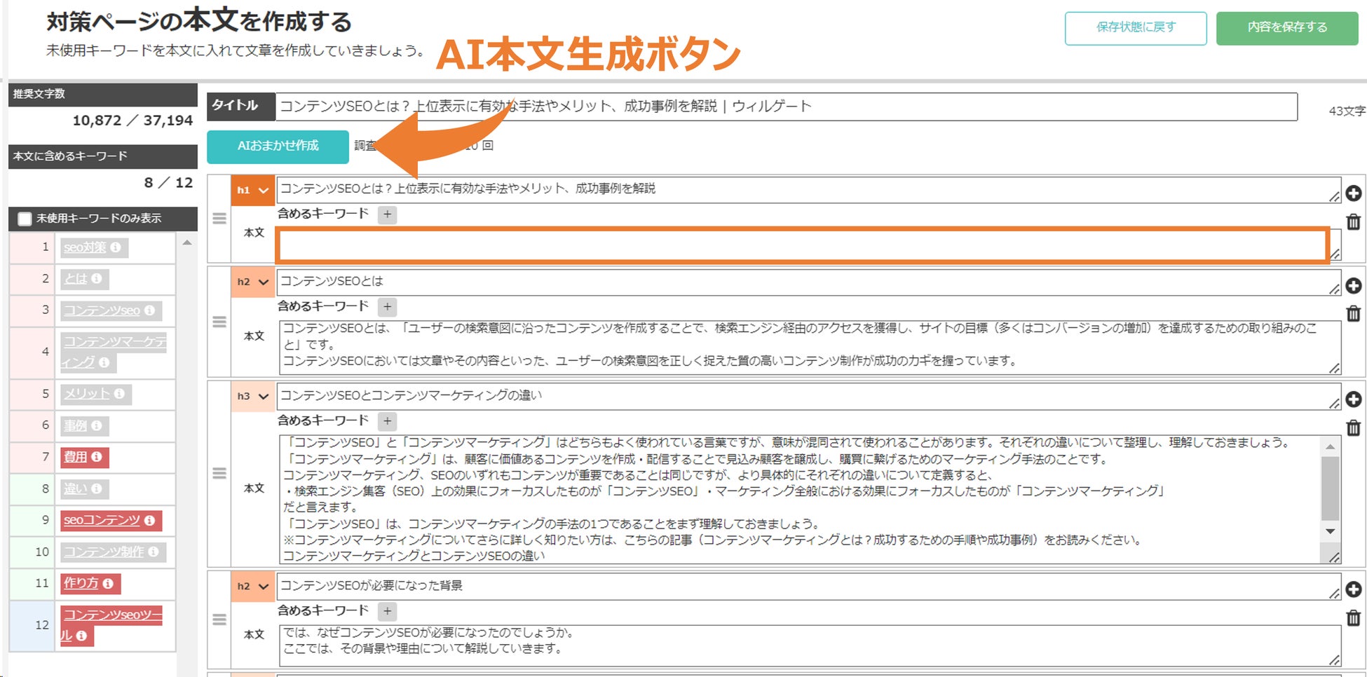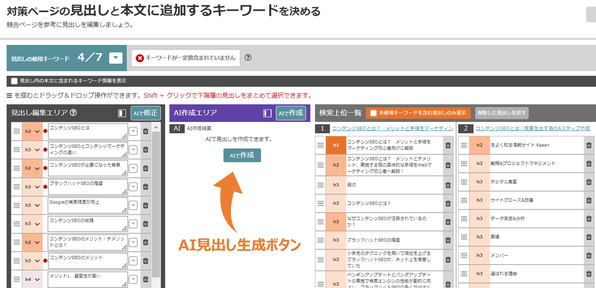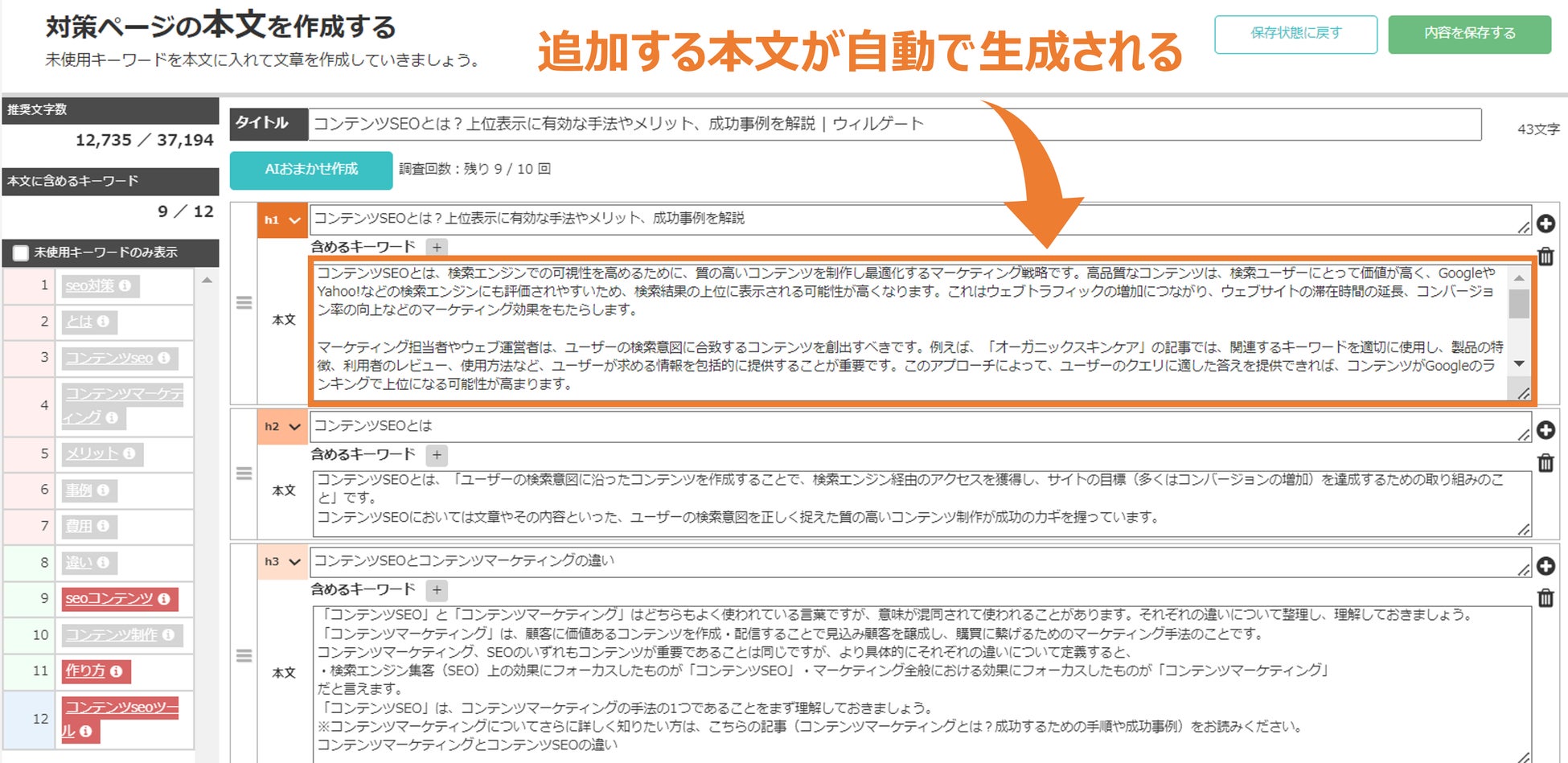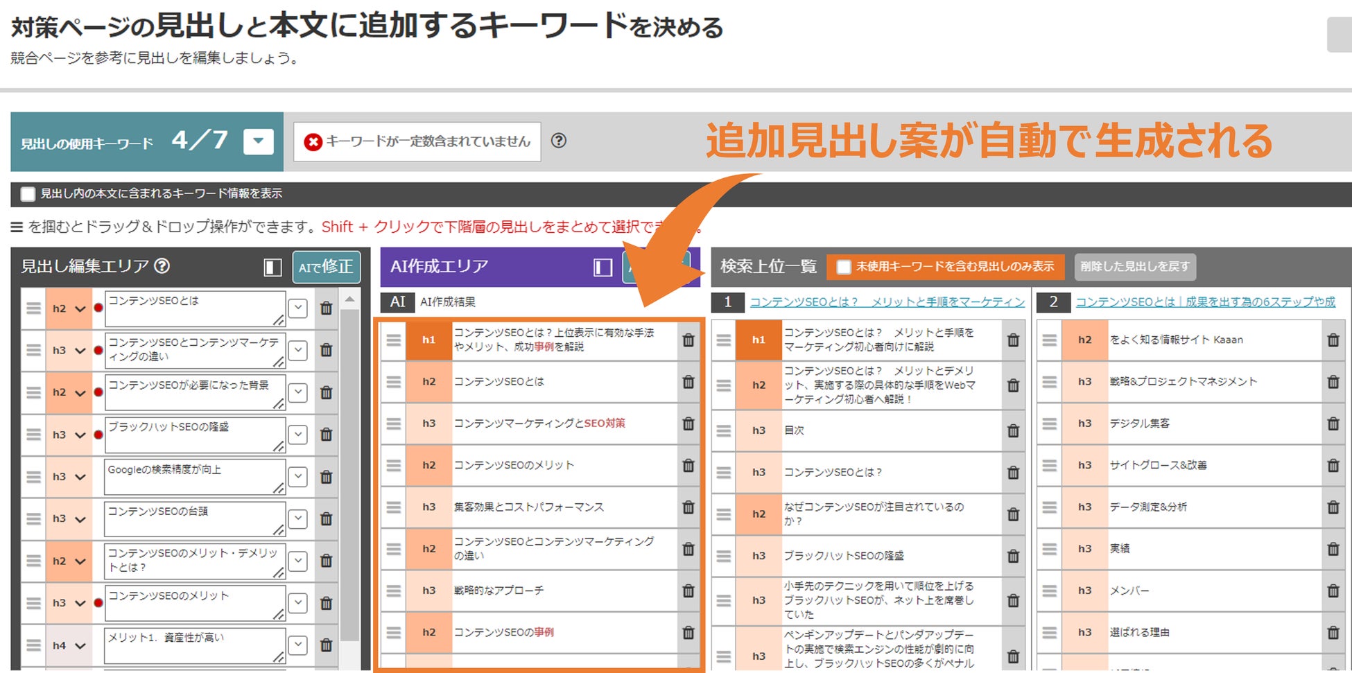 現在Googleの検索上位にあるページの内容をAIが分析し、記事内容を作成するため、検索ユーザーのニーズにマッチした記事作成ができるようになります。