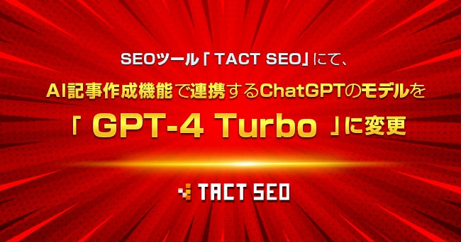 株式会社ウィルゲート(本社:東京都港区、代表取締役:小島 梨揮、以下 ウィルゲート)が提供するSEOツール「TACT SEO」は、AIおまかせ作成機能にて連携するChatGPTのモデルを「GPT-4」から「GPT-4 Turbo」に変更したことをお知らせします。