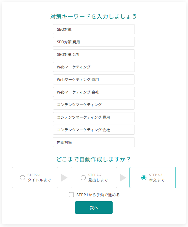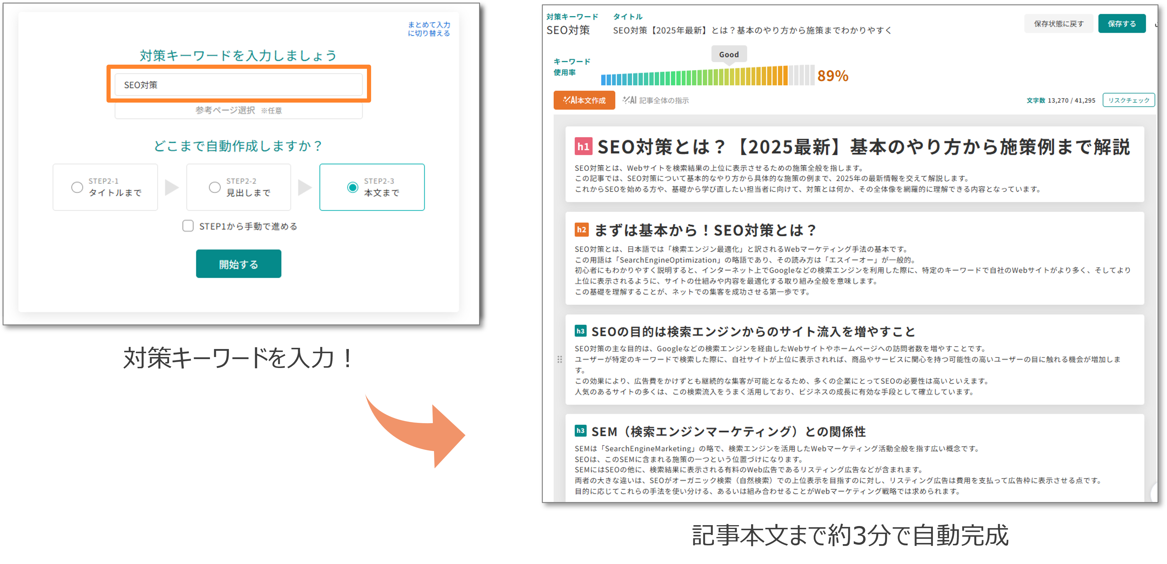 ・関連キーワードの選定やタイトル、見出し作成等のステップはツールが自動対応