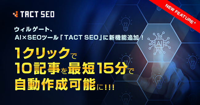 株式会社ウィルゲート(本社:東京都港区、代表取締役:小島 梨揮、以下「ウィルゲート」)が提供するAI×SEOツール「TACT SEO」は、簡単SEO記事作成機能の調査ステップを自動化し、ワンクリックで最大10キーワードまで記事を自動作成できる機能を新たに追加し、提供を開始したことをお知らせいたします。