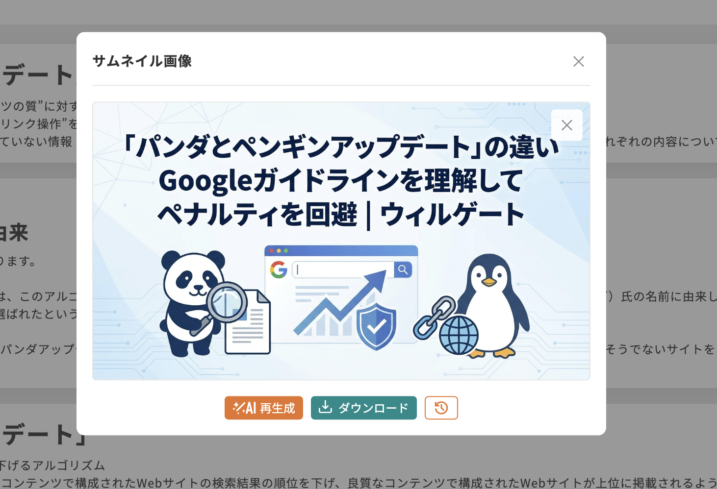 生成された画像がイメージと異なる場合は、再度1クリックで生成し直すことができます。また、過去に作成した画像の履歴を確認できる仕組みも備えており、複数の候補から最適な1枚を選択することも容易です。これにより、画像制作スキルがない担当者でも、迷うことなく高品質な記事を完成させることができます。