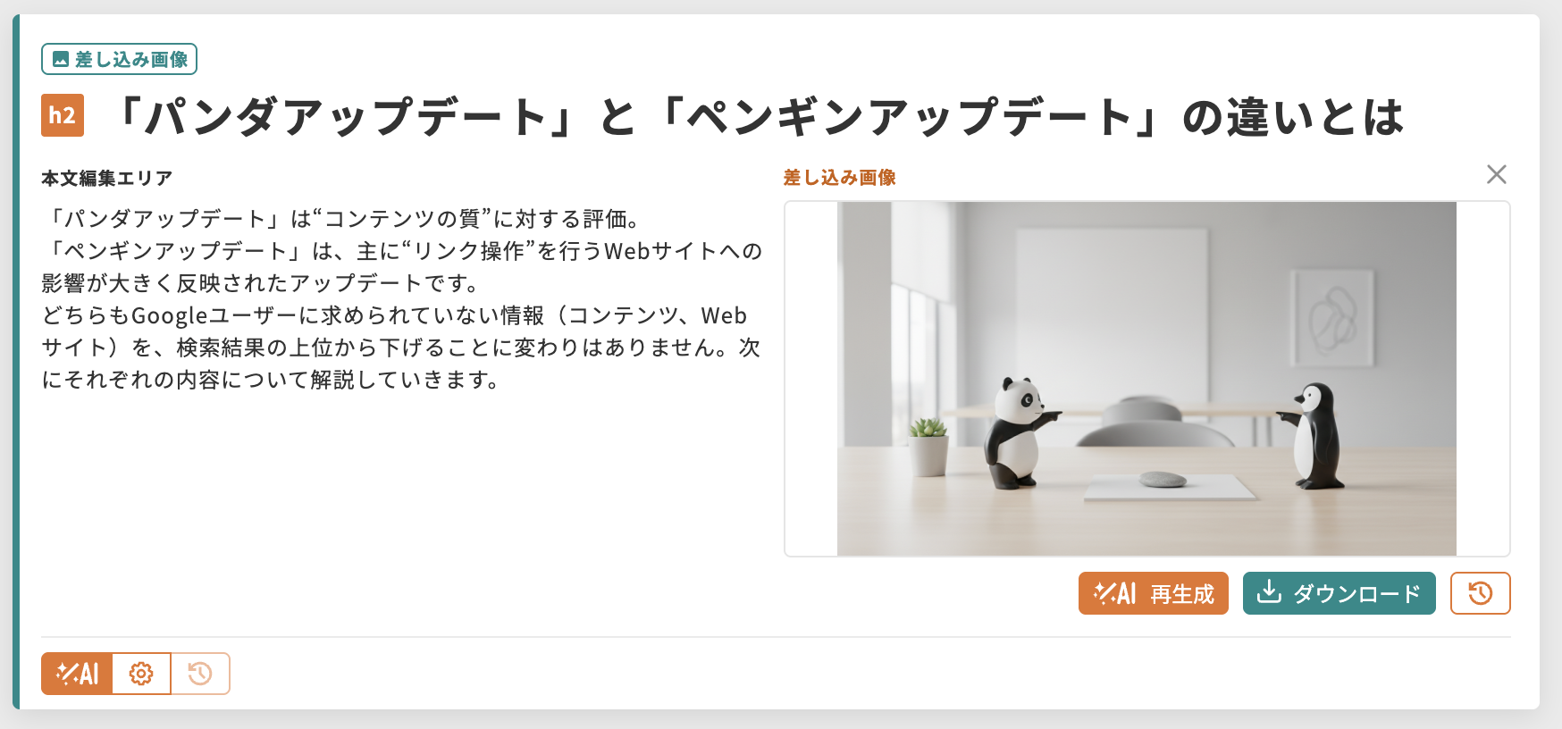 - 差し込み画像:任意の見出しに対して、解説内容を補足する最適なイメージ画像を生成。