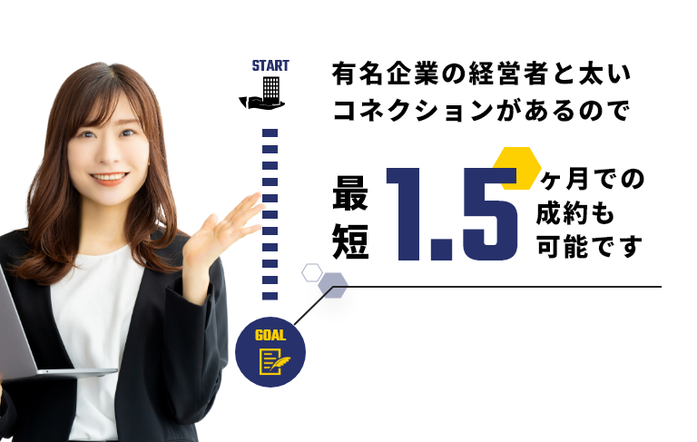 有名企業の経営者と太いコネクションがあるので最短1.5ヶ月での成約も可能です
