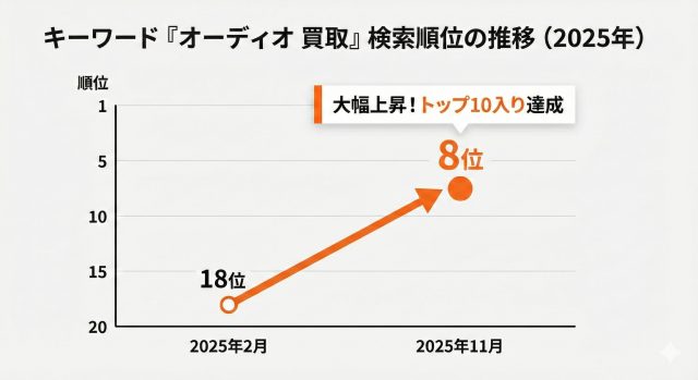最重要キーワードである「オーディオ 買取」の順位も上昇しています。以前は12位〜18位に停滞していましたが、1ページ目のトップ10以内に安定して表示されるようになり、それに伴って流入数が増えている状況です。ここ数ヶ月で順位が安定し始め、関連キーワードや主要エリアの地域キーワードでも続々とトップ10入りしており、サイト全体の露出が高まっています 。