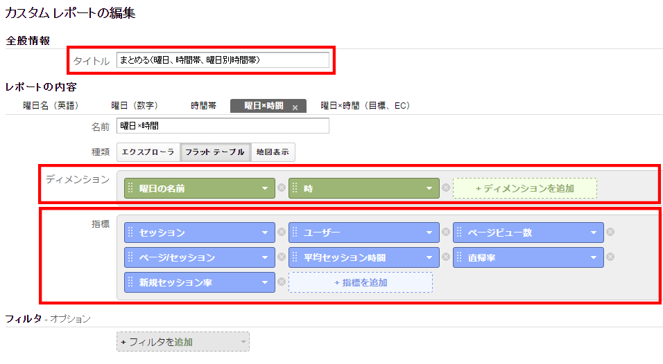アナリティクス画面左上部の「カスタム」>「+新しいカスタムレポート」と進むと以下の様な設定画面が表示されます。
