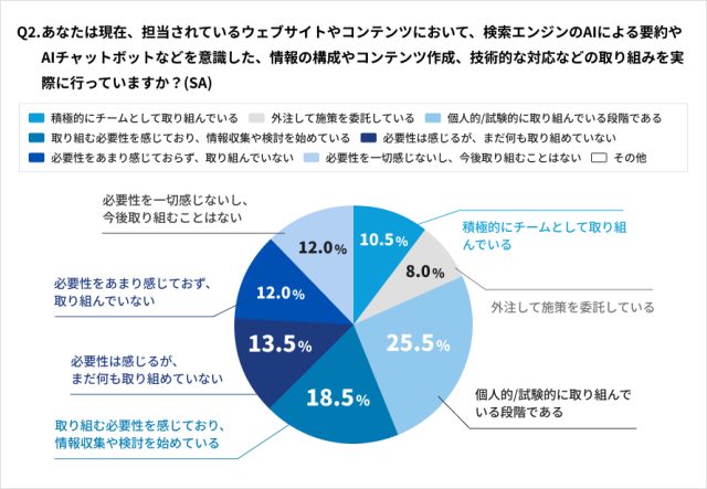 それによると、LLMOに取り組んでいる、情報収集や検討を始めているなど、何らかのアクションをとっている割合は62.5%でした。「積極的にチームとして取り組んでいる」「外注して施策を委託している」との回答はそれぞれ約1割であり、すでに具体的な施策段階へと踏み込んでいる割合は2割に達しています。