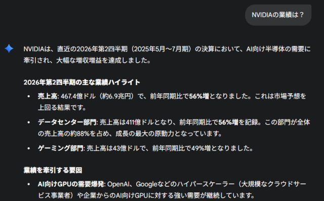 一方、‎Geminiの回答は直近四半期の数字を瞬時に回答し、前年同期間との比較や市場予想を上回ったこと、好業績の要因はAI向けGPUの需要が急増していることまで説明します。