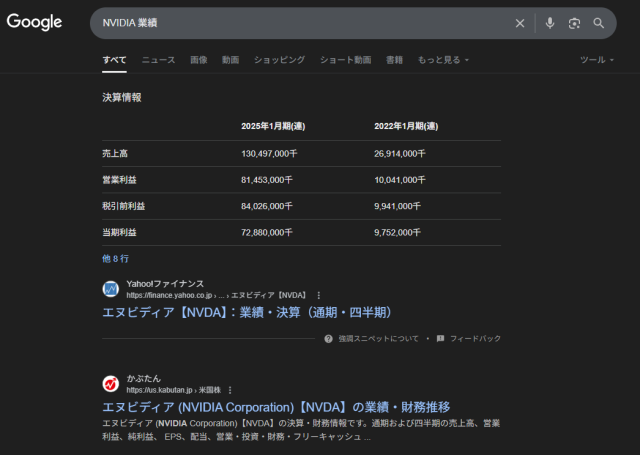 Googleで「NVIDIA 業績」と検索すると、以下のようなページが表示されます。上部に決算情報を表で示し、検索上位には「Yahoo!ファイナンス」「株探」などの業績や株価、経営指標などがデータベース化されたページが表示されています。