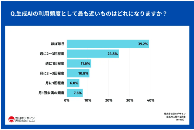 株式会社日本デザインはAIに対する意識調査を実施しており、使用頻度で「ほぼ毎日」との回答は4割を占めています。週に2~3回程度と合わせると6割以上。すでに日常の中にAIは溶け込んでいることが分かります。