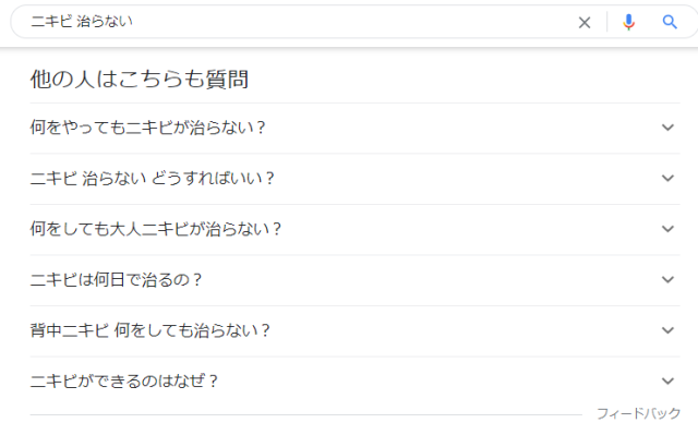 「SEOとは」で検索した場合は4項目表示されますが、「ニキビ 治らない」のクエリで検索した場合は6項目表示されます。