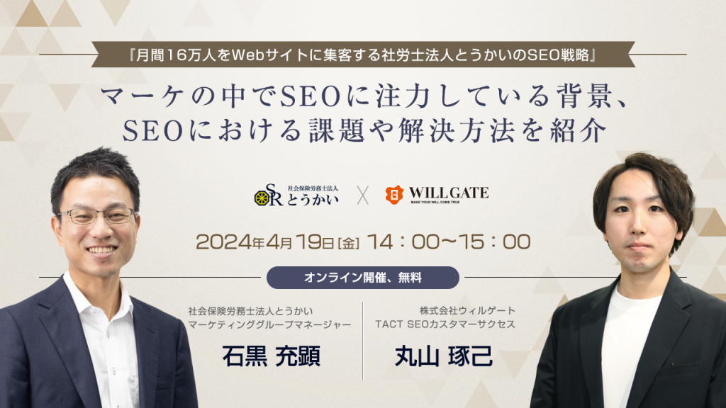専務取締役COOの吉岡が東京都南青山のオフィスから、SEO・BtoBマーケティング・オウンドメディア運営・コンテンツ制作のSEO戦略の策定方法から、記事作成の具体的なプロセスまで実践的な内容をお届けしています!ぜひお気軽にご参加ください!