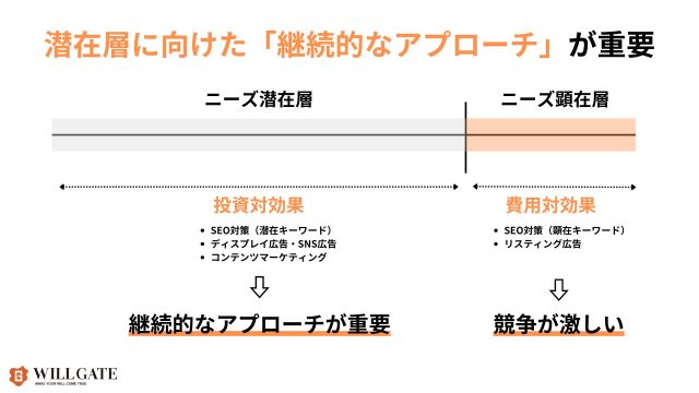 特に高関与商材の場合、購入頻度が少なく、ほとんどの顧客は潜在層です。よって、ニーズが顕在化した際に、いかに刈り取ることができるかがポイントです。